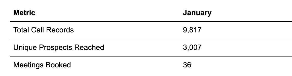 Our users & customers are relying on Deviceflow for daily operations. Now the question is how fast we can bring on new customers. GTM — What's ConvertingWe stood up our outbound engine in January — US-based BDR team targeting medical device manufacturers. First month results:Prospect breakdown by function: